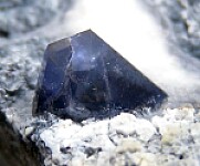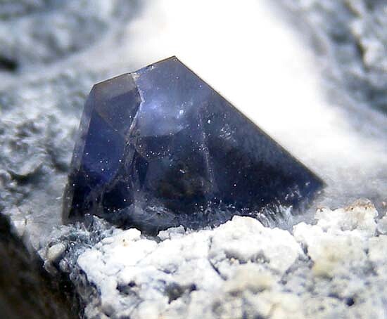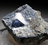 A 7mm blue Benitoite crystal with white Natrolite in a shallow vug in schist matrix. The Benitoite crystal is undamaged.