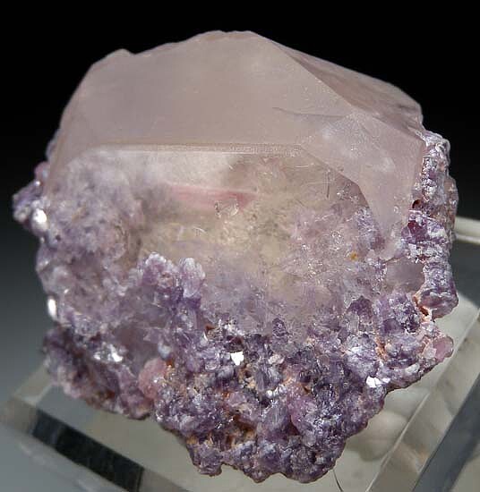 Transparent Morganite crystal with inclusions of Lepidolite and a pink Tourmaline crystal. Purple Lepidolite and pink Tourmaline wrap around the base and sides. The back and part of the top are contacted. Tourmaline inclusions in Morganite are rare.