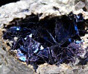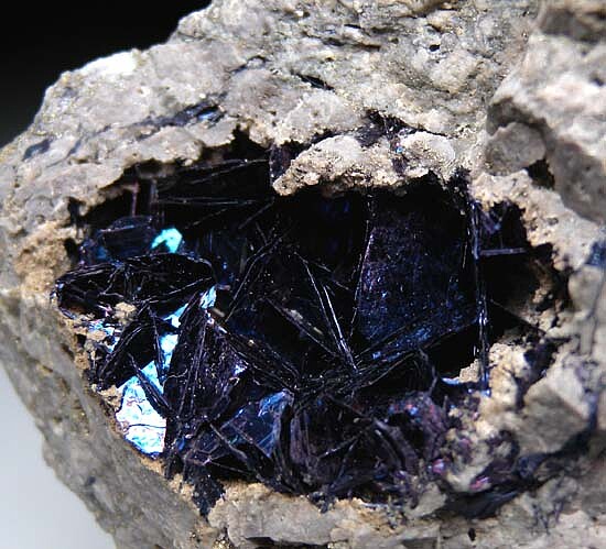 Irridescent blades of Covellite well protected in a vug. Ex. H.R. McBroom collection with label.