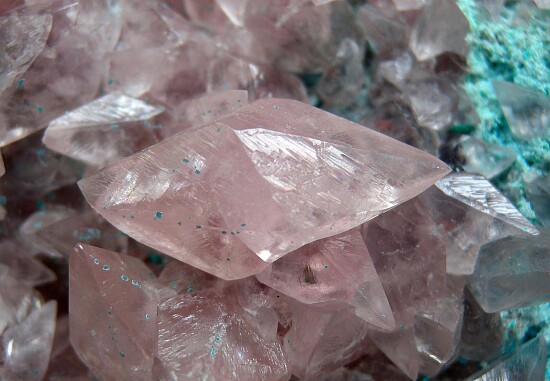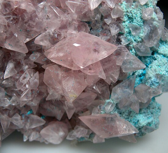 Colorful specimen of pink Cobaltian Calcite crystals on blue Plancheite. The Calcites are translucent to transparent scalenohedrons including some double terminated crystals to 2.2cm.