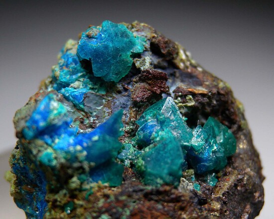 Good sized, well formed and fairly isolated crystals of Liroconite to 6mm on matrix. The color ranges from intense blue to a more greenish blue. There are at least six larger crystals on the specimen with additional small crystals. One of the crystals was found to 'wiggle' a bit during the cleaning process and was stabilized underneath with a tiny dot of adhesive (not visible). Liroconite is a rare copper species with the best specimens found at this mine, which is also the type locality for the species. Wheal Gorland began operation in 1792 and the best Liroconite specimens were found in the mid 1800s. The combination of rarity and beauty keep these in high demand and they are only rarely available for sale, usually when an old collection is recycled.