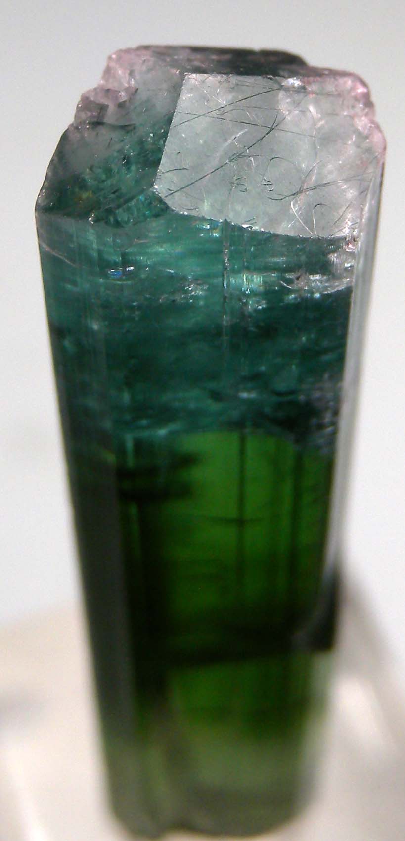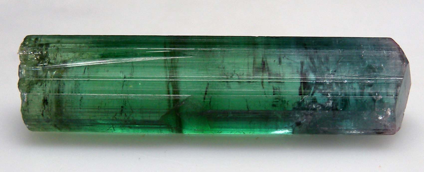 Transparent green single Tourmaline crystal from Brazil. The crystal is blue at the termination. Complete all around and of uniform shape. Weighs 5.0 grams.