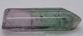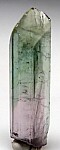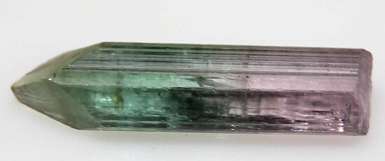 Single gem Tourmaline crystal from Brazil. Pink in the lower half and green on top with a steep termination. Complete all around and undamaged. Valued at $250.