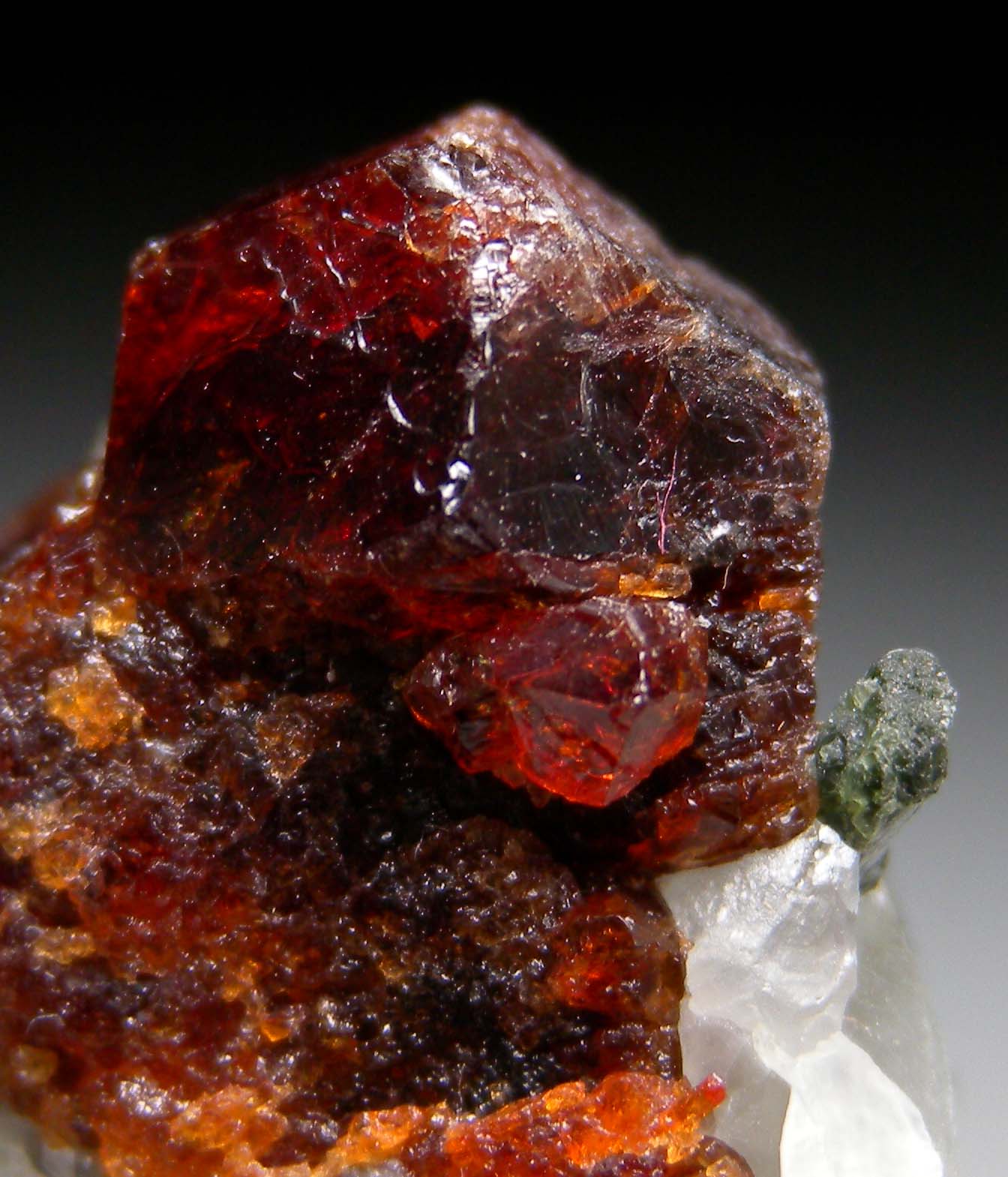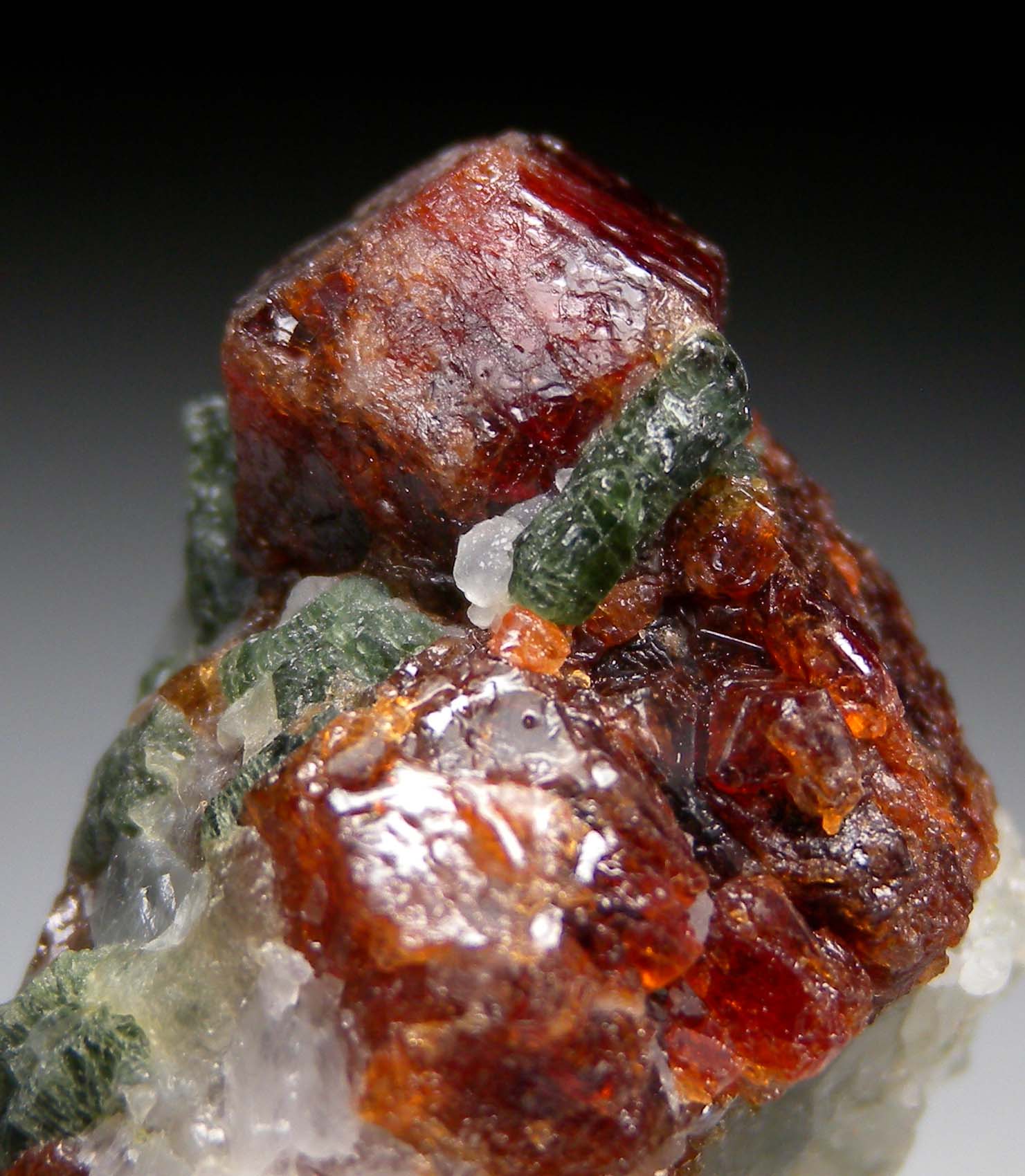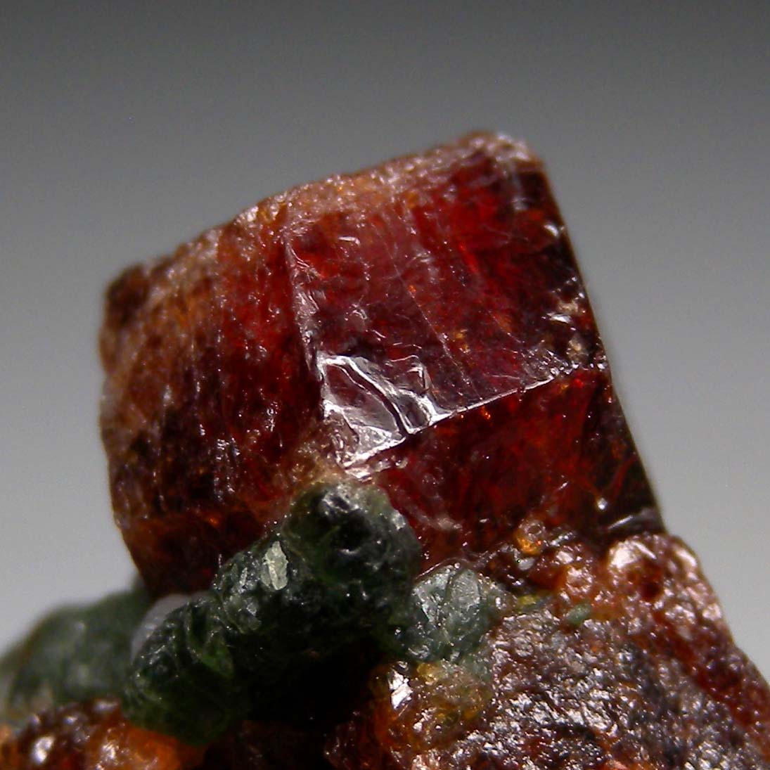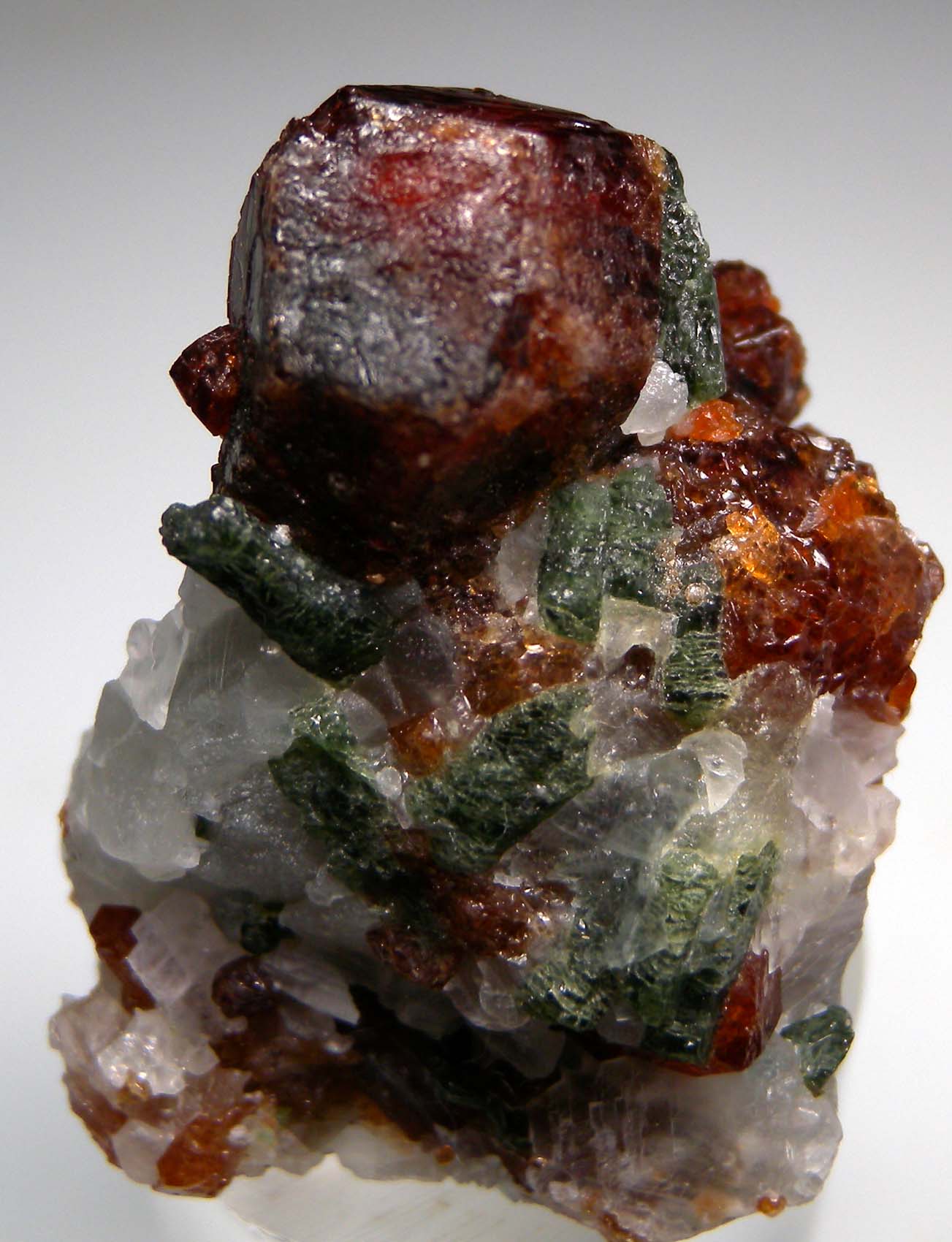 A 1.7cm complete red/orange Grossular crystal on Calcite. Green Diopside crystals and other Grossular crystals are embedded in the Calcite.