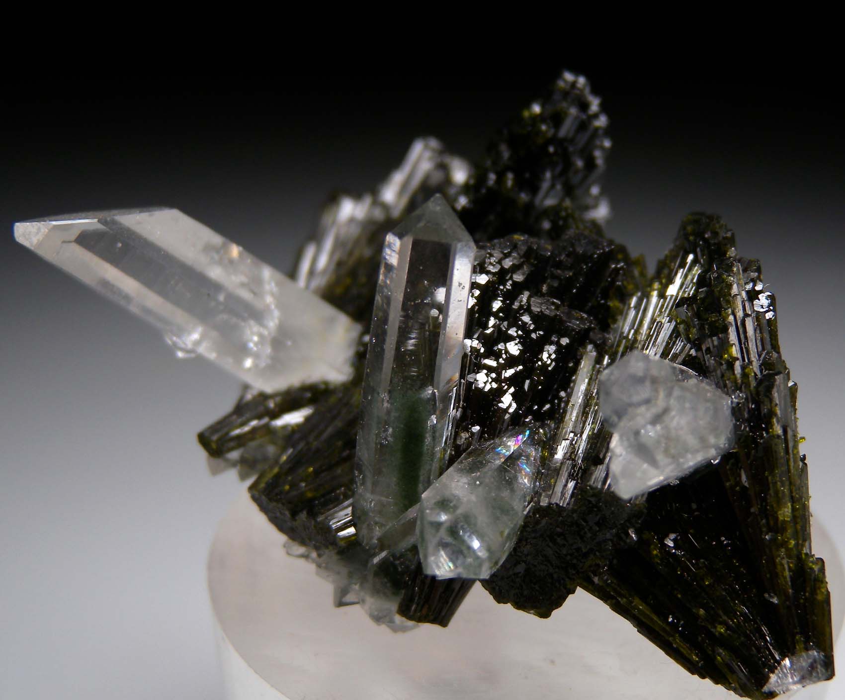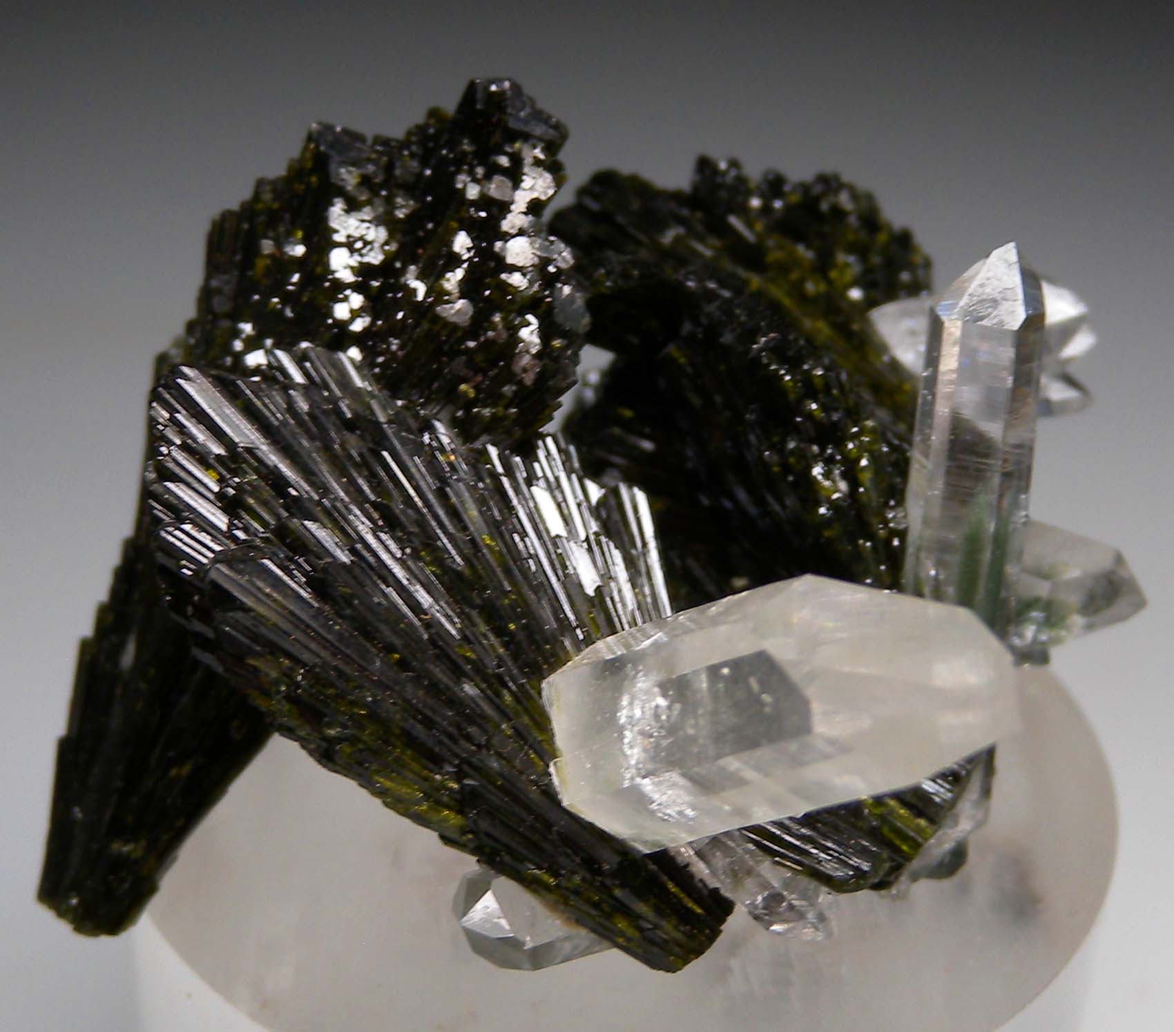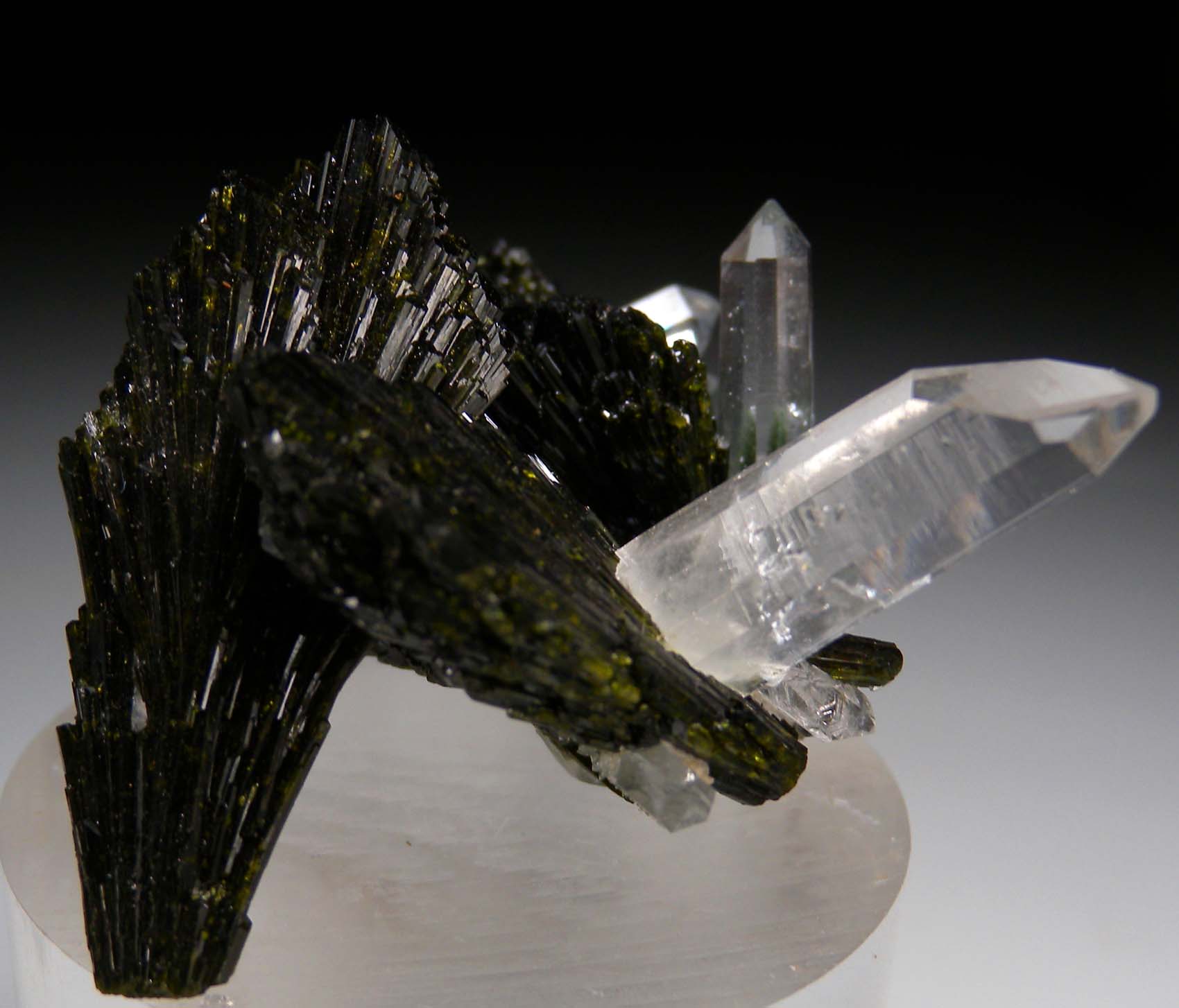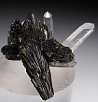 Highly aesthetic example (my favorite I've ever seen) from this find in Pakistan. Lustrous deep green fans of Epidote with clear Quartz crystals attached and sticking straight out of the Epidote fans. This is an undamaged specimen and a near floater with many of the Epidote fans crystallized at the narrow bases too.