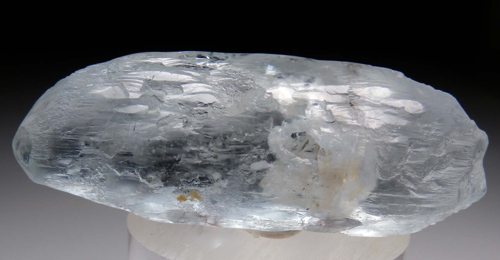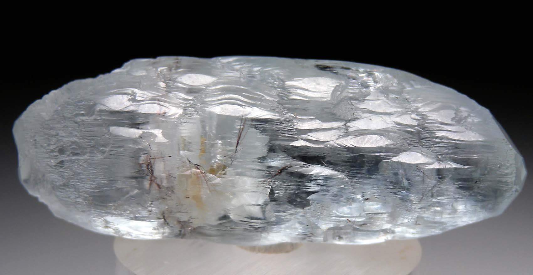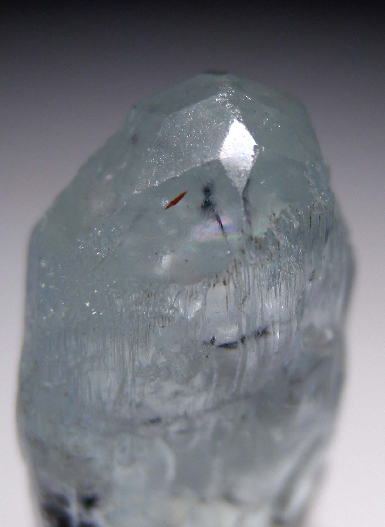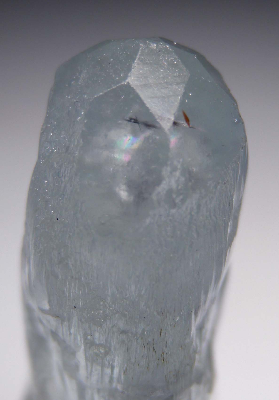Doubly-terminated, etched blue Aquamarine crystal. Though mostly etched, the terminations show small, smooth flat crystal faces. Weighs 18.72 grams.