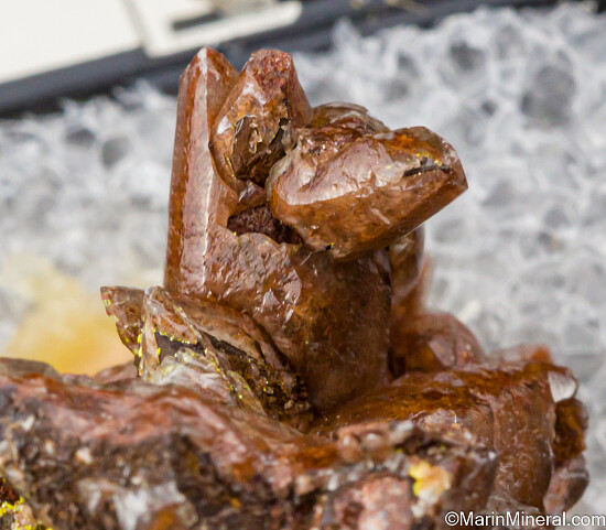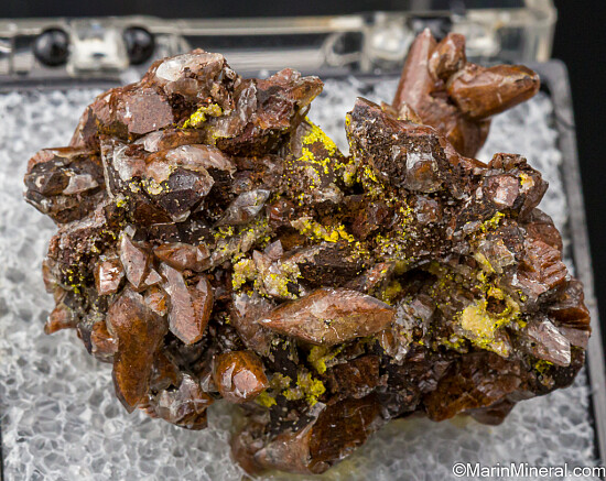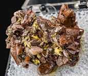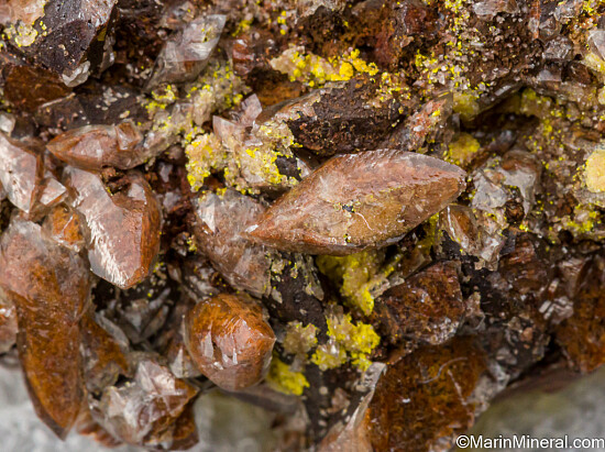 Yellow possible Metatyuyamunite on brown scalenohedral Calcite crystals. Ex. Chuck Trantham collection, purchased by Chuck in 1975 in a rock shop in Grand Junction, Colorado.