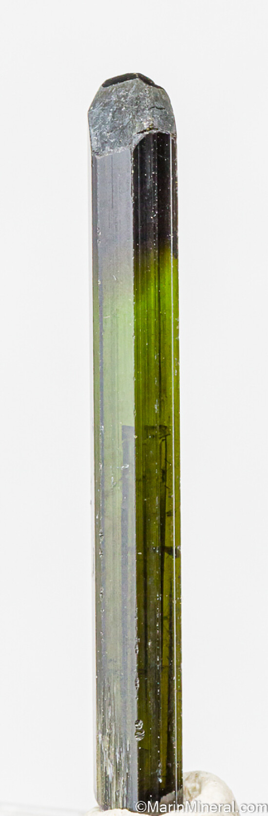 Gem Tourmaline crystal recently mined from the famous St. Anne's Mine in the Karoi district of Zimbabwe. Fully terminated, complete, and undamaged. It's transparent top to bottom with a good medium green color over most of the crystal with a darker green (though still transparent) termination. The termination is multi-faceted and complex. Excellent quality Tourmaline.