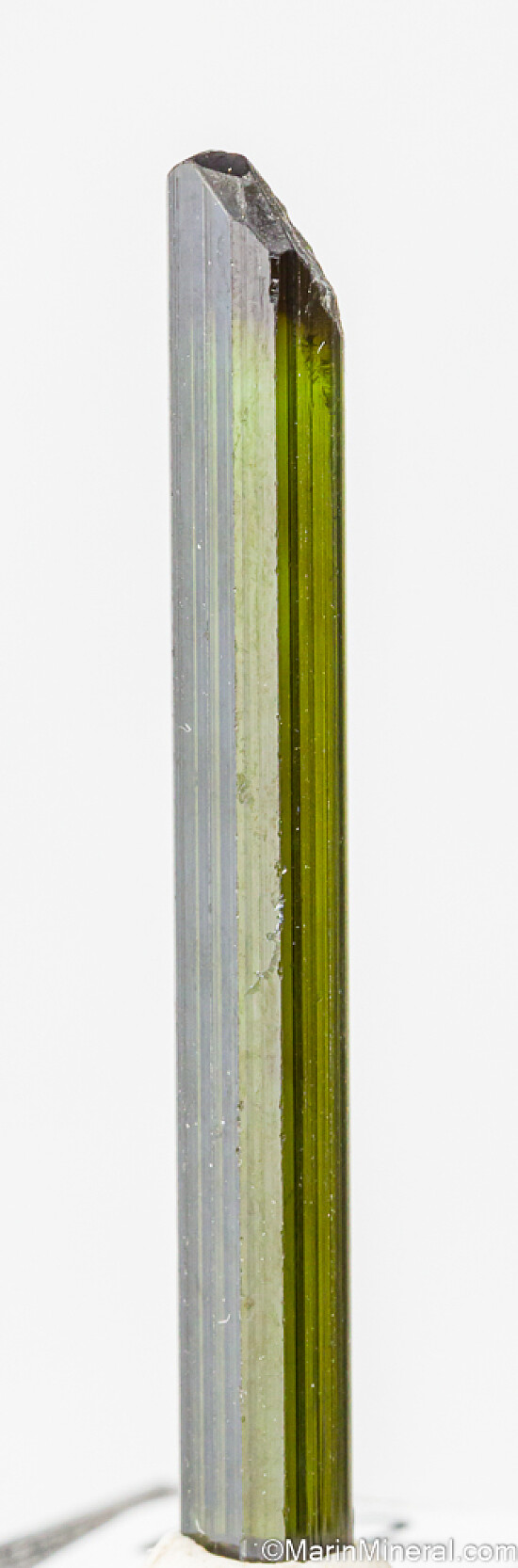Gem Tourmaline crystal recently mined from the famous St. Anne's Mine in the Karoi district of Zimbabwe. Fully terminated, complete, and undamaged. It's transparent top to bottom with a good medium green color over most of the crystal with a darker green (though still transparent) termination. The termination is multi-faceted and complex. Excellent quality Tourmaline.