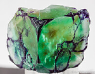 Intensely colored translucent green and purple Fluorite crystal. The Fluorite is cubic and etched on the bottom half and has wild purple coloration on the surface.