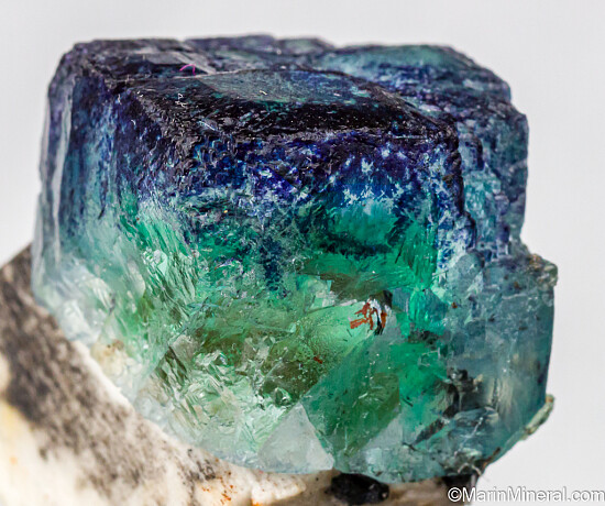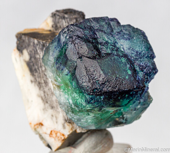 Intensely colored Fluorite attached to a twinned Orthoclase crystal. The Fluorite is cubic but with lumpy, stepped growth surfaces and has both green and blue/purple coloration.