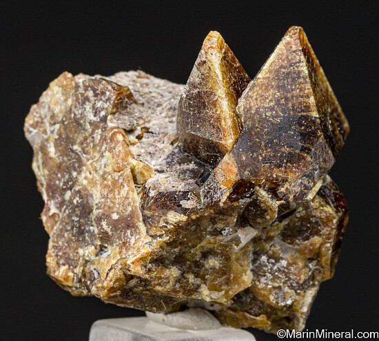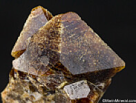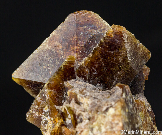 Double-terminated, translucent rootbeer brown Vesuvianite crystals to 3cm on a solid matrix of massive Vesuvianite. A wonderful example of a California Vesuvianite and of higher quality than most from this locality.