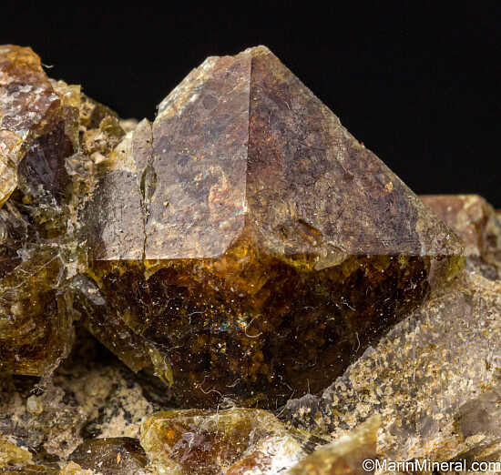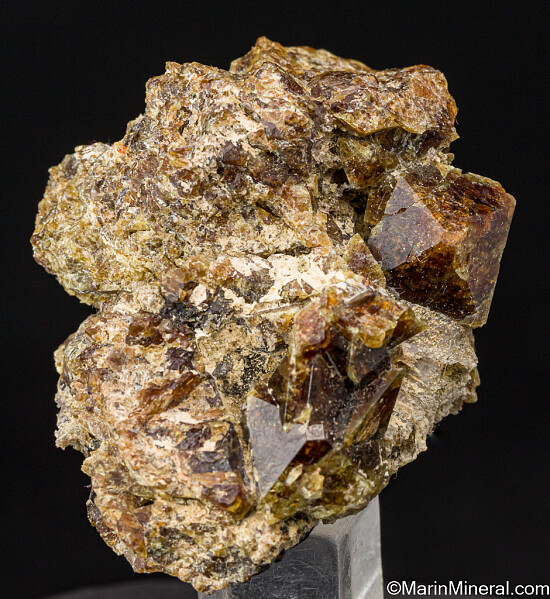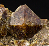 Lustrous, translucent rootbeer brown Vesuvianite crystals to 1.8cm on a solid matrix of massive Vesuvianite. A wonderful example of a California Vesuvianite and of higher quality than most from this locality.