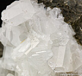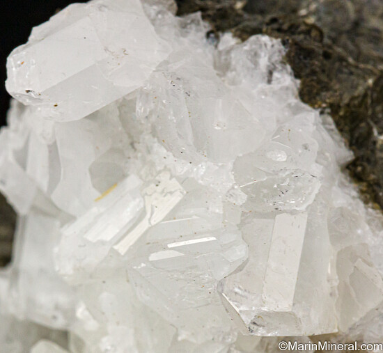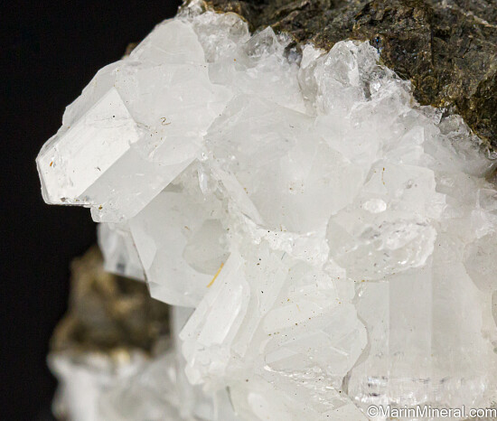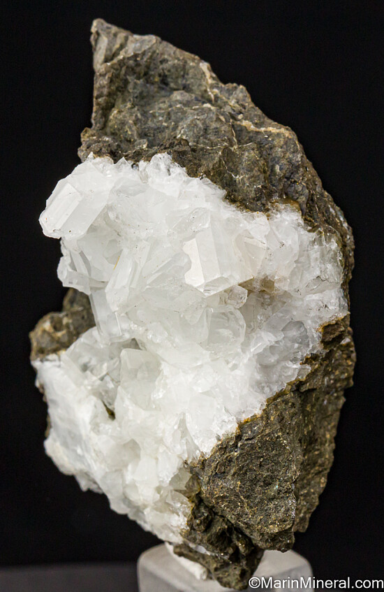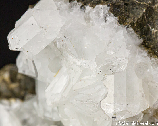 Glassy white Datolite crystals in a vug that contrast well against the dark rock matrix. Found by a friend while prospecting in this area known for Jadeite and Rosenhahnite crystals. These were found in a single boulder that was excavated during construction work on Highway 101. This boulder produced what are considered Californias's best Datolite. Individual crystals on this specimen reach 1 cm in size and are translucent to transparent. There are partial crystals along the edges, but also some perfect crystals with tips so transparent they look like glass. Superb piece for a California suite of minerals.