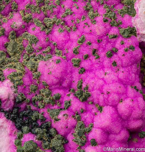 Angular yellowish green crystals of Kolwezite pseudomorphs after Cuprite on velvety, botryoidal pink Cobaltoan Calcite. A beautiful and colorful combination specimen.