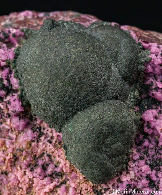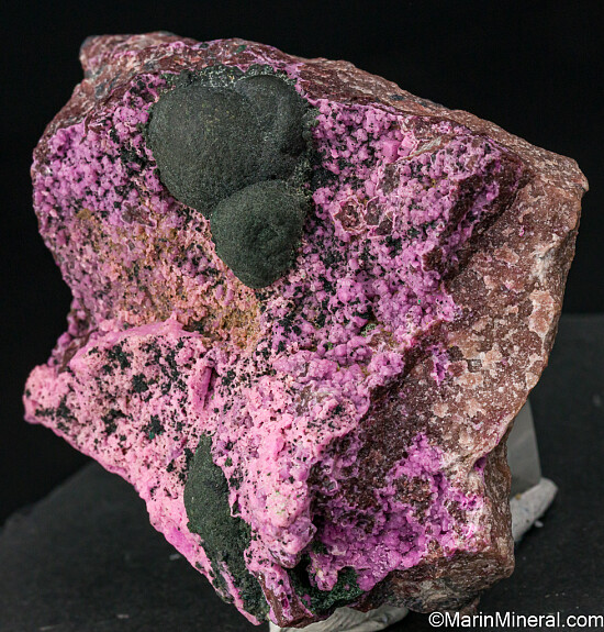 Dark olive green botryoidal Kolwezite atop rhombs of pink Cobaltoan Calcite (or possibly Cobaltoan Dolomite) creating a stunning mixture of colors and forms. Kolwezite is a Copper Cobalt Carbonate Hydroxide and this is the type locality for the species. A beautiful display piece and combination specimen of two desireable species together. Sawcut on back.