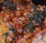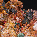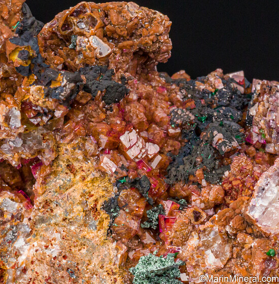 Black Heterogenite and green Malachite atop Cobaltoan Calcite. The Calcite on this specimen is brown with the Cobaltian Calcite forming a pink final layer over earlier generation of the brown Calcite, giving it a more subdued look than others but still with vivid 'hot' pink flashes all over.