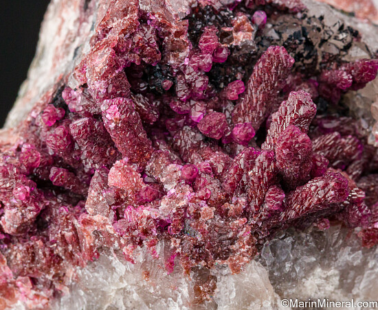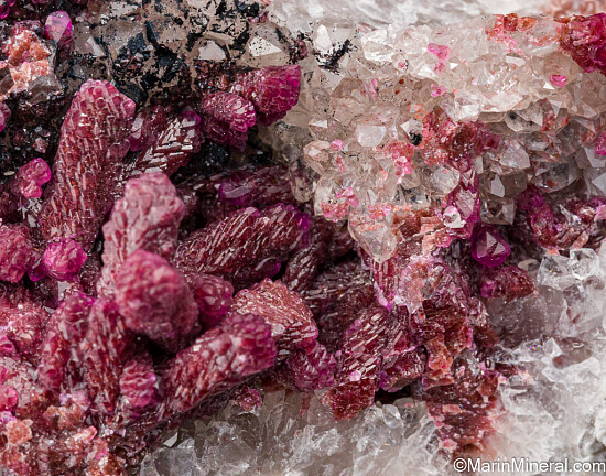 Unusual finger-like formations of pink Cobaltoan Calcite in a Quartz crystal lined vug. The individual crystal aggregates reach 8mm tall. There are so many neat and unusual minerals found in this part of the world and this certainly is one of them.