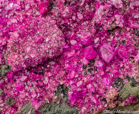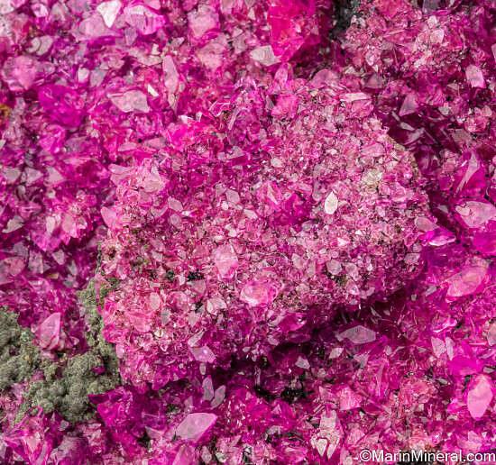 Dark olive green botryoidal Kolwezite atop rhombs of vivid pink Cobaltoan Calcite (or possibly Cobaltoan Dolomite) creating a stunning mixture of colors and forms. The main Kolwezite is a superb hemispherical group 1.1 cm wide and perfectly centered in the Cobaltian Calcite. Kolwezite is a Copper Cobalt Carbonate Hydroxide and this is the type locality for the species. A beautiful large display piece and combination specimen of two desireable species together.