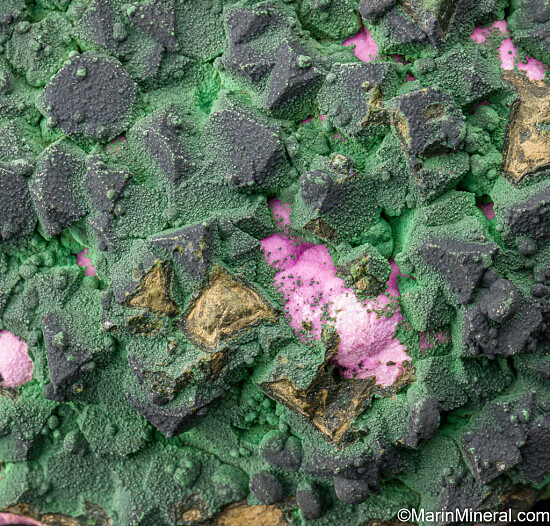 Dense coverage of dark green Kolwezite pseudomorphs after Cuprite over a layer of botryoidal pink Cobaltian Calcite. Kolwezite is a Copper Cobalt Carbonate Hydroxide and this is the type locality for the species.