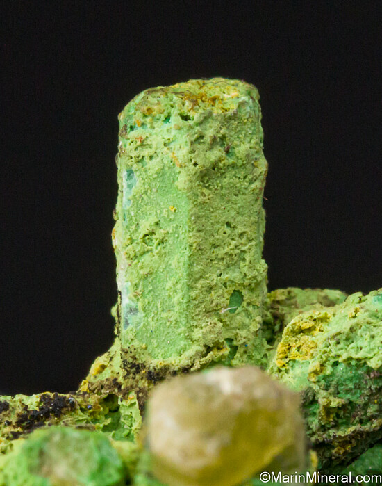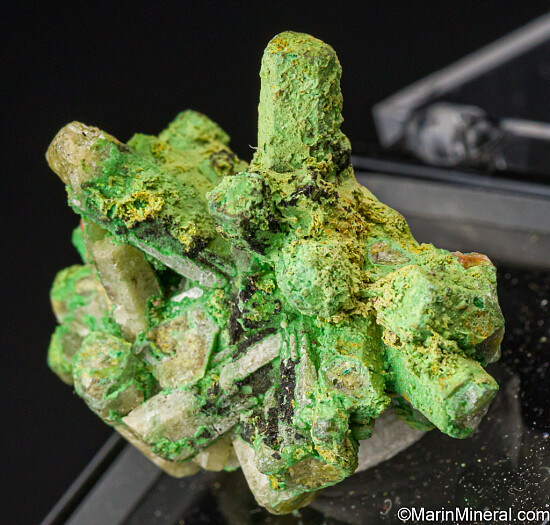 An old classic Tsumeb specimen of green Bayldonite on or partially pseudomorphing elongated, hexagonal Mimetite crystals. These were found in the 1st oxidation zone that dates to the late 1800s to early 1900s.