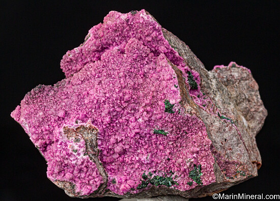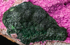 A 4cm wide cluster of dark green Malachite on rhombs of pink Cobaltoan Calcite (or possibly Cobaltoan Dolomite) creating a stunning mixture of colors and forms. A beautiful and colorful combination specimen. Valued at $250.