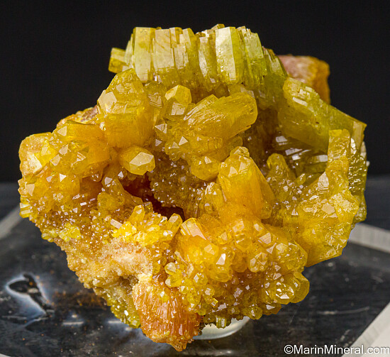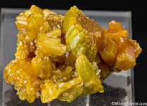 Beautiful cluster of two generations of Pyromorphite. The first generation in comprised of larger orange crystals of arsenian Pyromorphite with crystals to 1.5cm upon which grew very bright, lustrous yellow to green Pyromorphite.