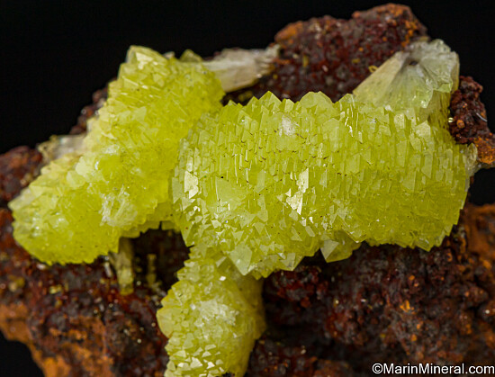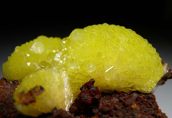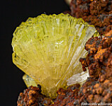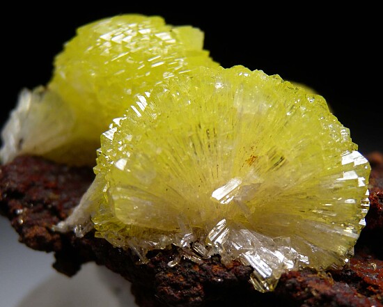 Vivid yellow to yellow/green 'pinwheel' crystal clusters on Limonite. Beautiful color.