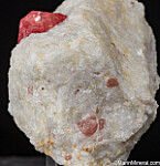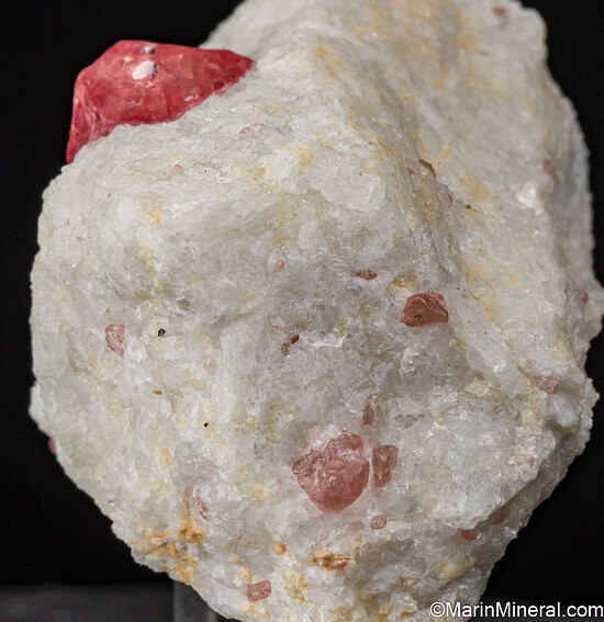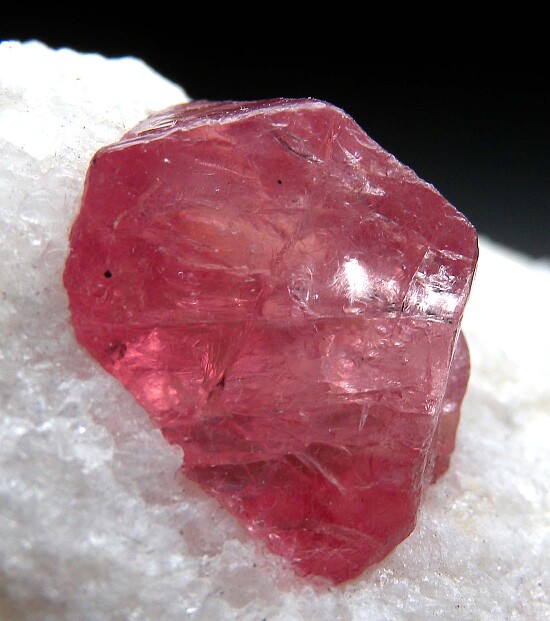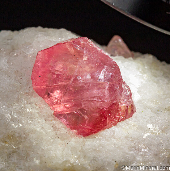 A 1.5cm crystal of pink Spinel in a matrix of white marble with other smaller Spinel crystals. A complete and gemmy octahedral crystal with gem facet grade areas.