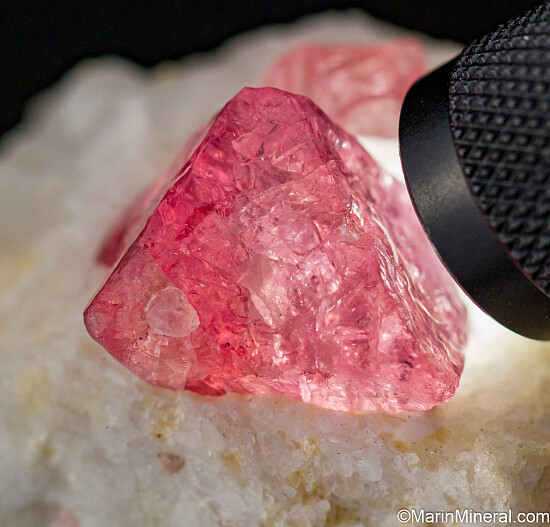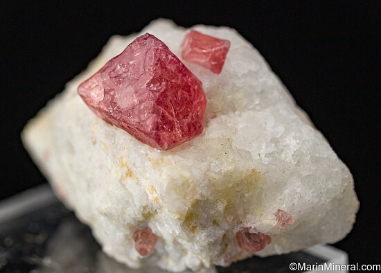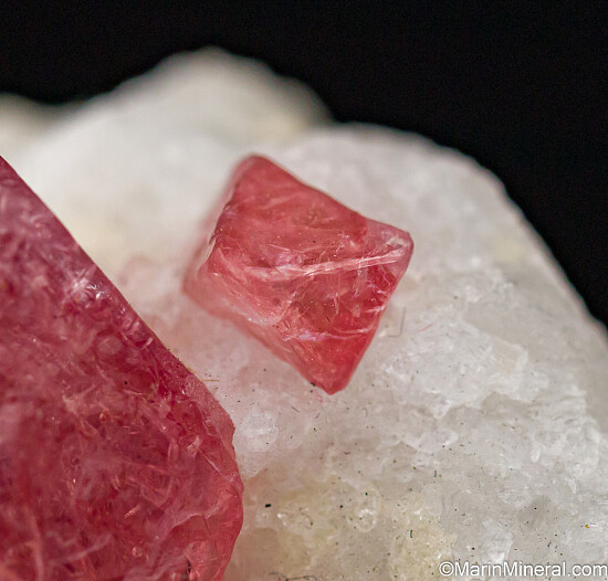 A 1.7cm crystal of pink Spinel in a matrix of white marble with another smaller 8mm Spinel crystal behind it. A complete and gemmy octahedral crystal with good transparency.