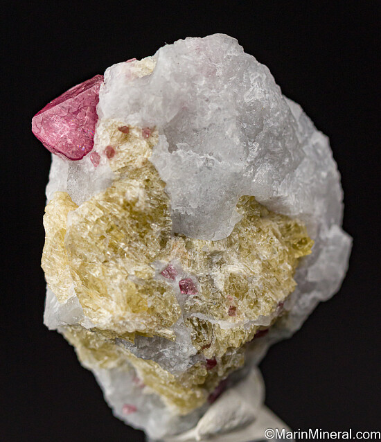 A 1.3cm crystal of pink Spinel in a matrix of white marble with other smaller Spinel crystals. A complete and undamaged gemmy spinel-twinned crystal.