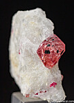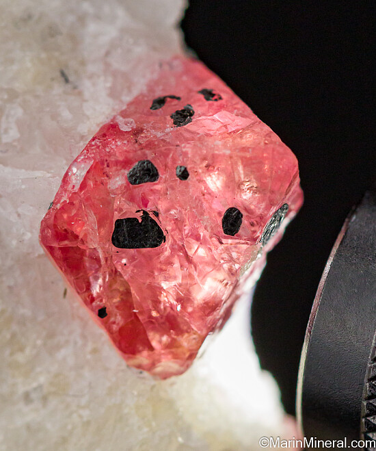 A 1.5cm crystal of pink Spinel in a matrix of white marble with other smaller Spinel crystals. A complete and undamaged gemmy octahedral crystal with attached and included Graphite crystals.