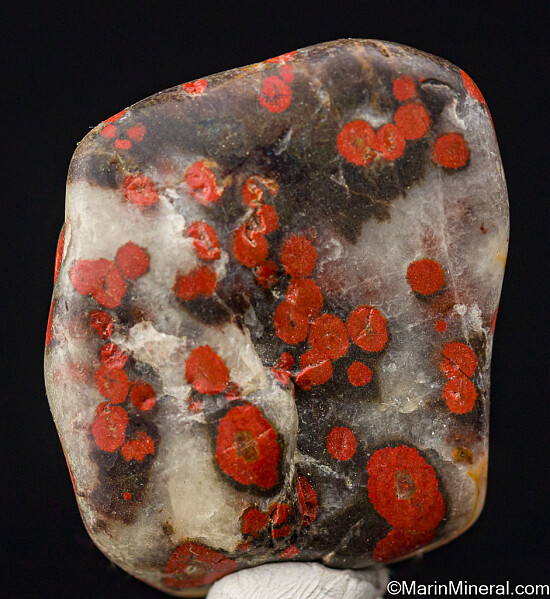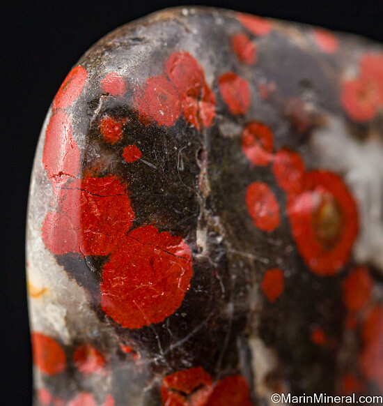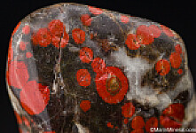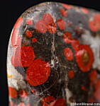 Polished specimen of Poppy Jasper with distinctive red orbicular formations. Named the official rock of Morgan Hill back in 2002, it is now hard to come by.