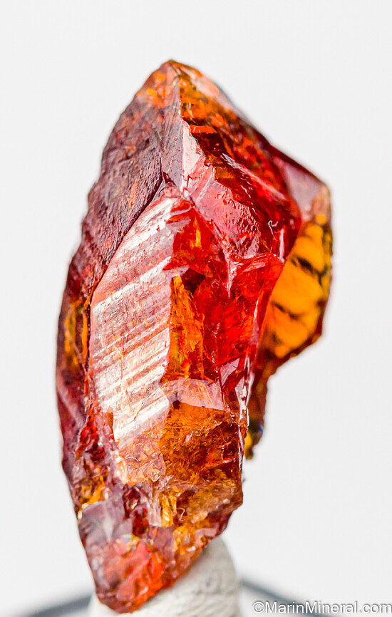 Rare red/orange Grossular crystal from Tanzania. An elongated crystal that shows twinning growth and areas of transparency. This was acquired from a gem dealer and was the only good crystal in a parcel of facet rough from an unnamed prospect. Unusual.