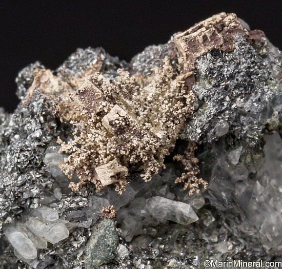 Clusters of cubic Silver crystals on matrix that have been exposed from white Calcite. Cubic Silver crystals are uncommon and these are superbly formed, sharp cubes of about 3mm in size. The calcite has been mostly etched away leaving the cubic Silver crystals and hackly Silver along with small Quartz crystals on the matrix. There is one good sized crystal 3mm in size. Was listed at $280.