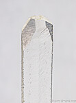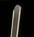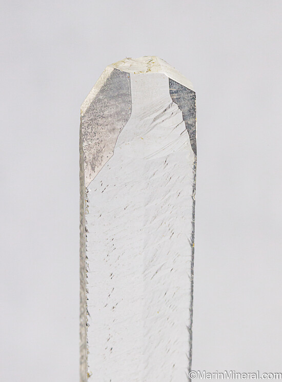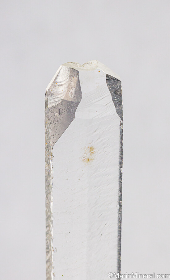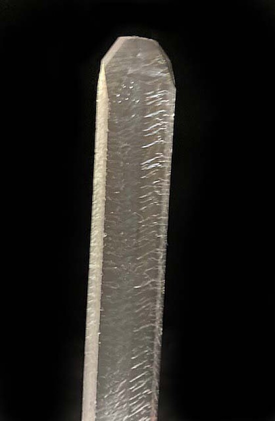 Long, slender crystal of laboratory grown Quartz. This came from an old collection that had lots of 1980s era specimens, though the exact date of when it was grown is unknown but likely dates back to the 1950s when these were grown for the telecommunications industry. It's water clear and pristine with dimpled/wavy surfaces over the prism faces and flat, glassy termination faces. These were grown between two metal pins and each tip has a small indentation caused by the pins. Rare historic specimen. Valued at $150.