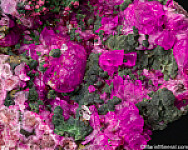 Dark olive green spherical clusters of Kolwezite atop vivid pink Cobaltoan Calcite. This is the top color for Cobaltian Calcite. There are also areas of fibrous bright green Malachite and small clear Quartz crystals.Kolwezite is a Copper Cobalt Carbonate Hydroxide and this is the type locality for the species. A beautiful display piece and combination specimen.