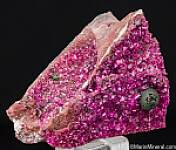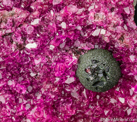 Dark olive green spherical cluster of Kolwezite atop vivid pink Cobaltoan Calcite. Kolwezite is a Copper Cobalt Carbonate Hydroxide and this is the type locality for the species. A beautiful display piece and combination specimen of two desireable species together. Sawcut on back.