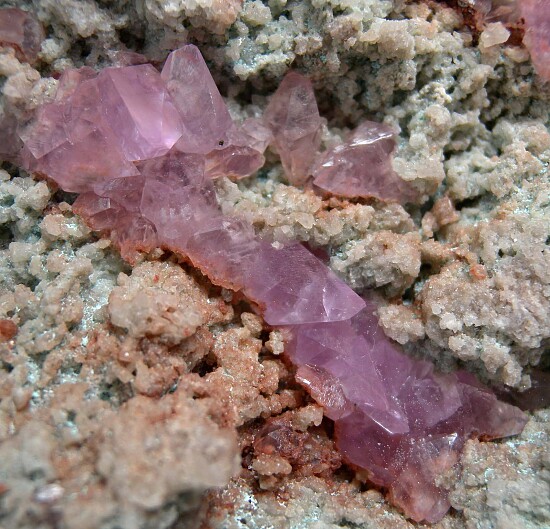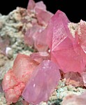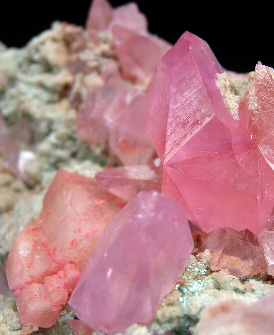 Large, gemmy pink crystals of Cobaltian Calcite. These large scalenohedral crystals are the type that make Cobaltian Calcite from this area world famous and are hard to find. The main crystal is 2.7cm and perfect, as are the other crystals with the exception of the crystal below the main crystal which has a cleaved termination. A light dusting of Chrysocolla on the matrix adds even more color to this large, impactful specimen.