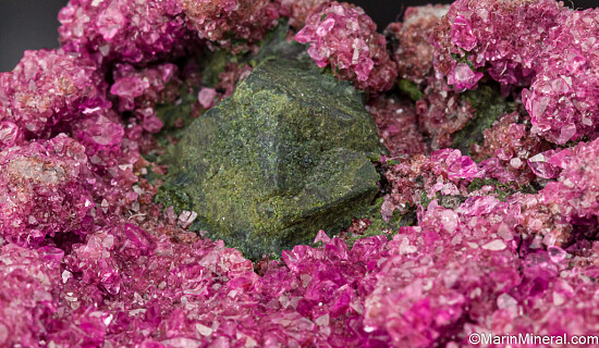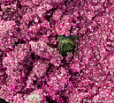 Angular deep green crystals of Kolwezite pseudomorphs after Cuprite on crystals of reddish pink Cobaltoan Calcite. A beautiful and colorful combination specimen. Sawcut on back.
