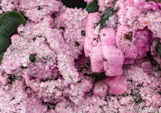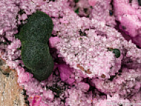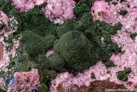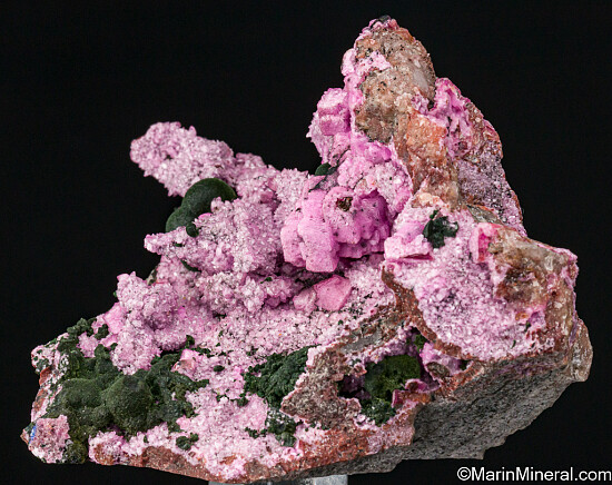 Dark olive green Kolwezite atop rhombs of pink Cobaltoan Calcite (or possibly Cobaltoan Dolomite) creating a stunning mixture of colors and forms. Kolwezite is a Copper Cobalt Carbonate Hydroxide and this is the type locality for the species. A beautiful large display piece and combination specimen of two desireable species together. Sawcut on back.