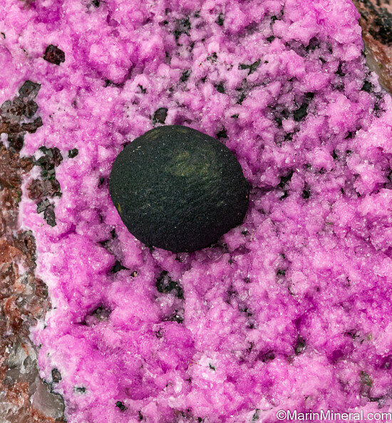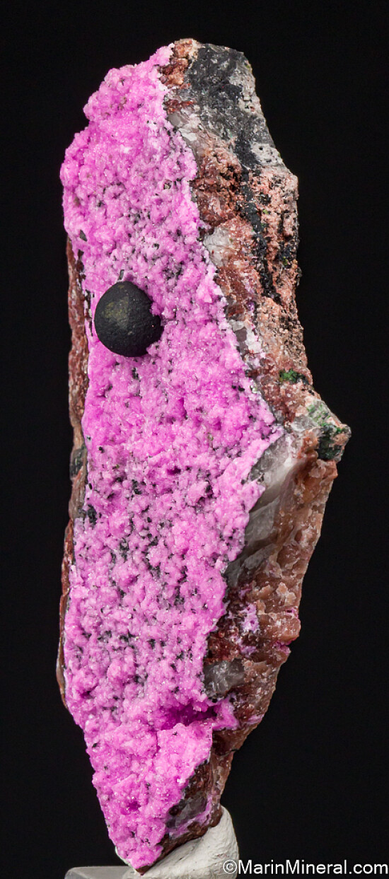 Dark olive green spherical cluster of Kolwezite atop bright pink Cobaltoan Calcite. Kolwezite is a Copper Cobalt Carbonate Hydroxide and this is the type locality for the species. A beautiful, good sized display piece and combination specimen of two desireable species together. Sawcut on back. This is an excellent piece with a superb Kolwezite well centered in the Cobaltian Calcite. Valued at $300.