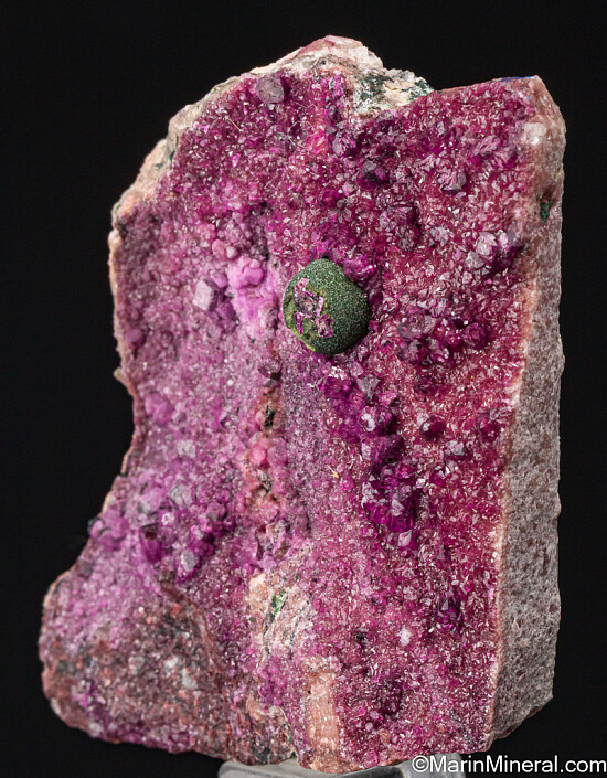 Dark olive green spherical cluster of Kolwezite atop purple pink Cobaltoan Calcite. Kolwezite is a Copper Cobalt Carbonate Hydroxide and this is the type locality for the species. A beautiful display piece and combination specimen of two desireable species together. Sawcut on back.