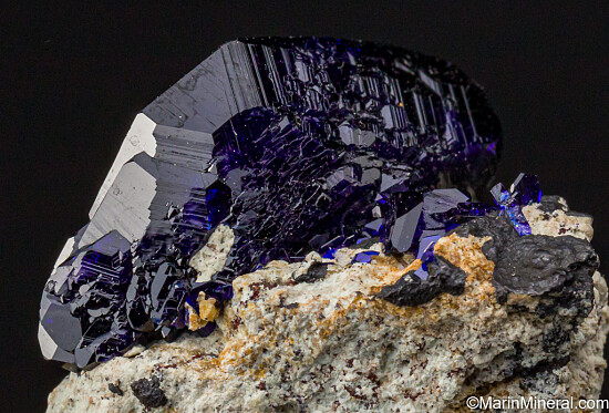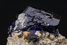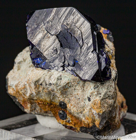 A 2.8cm double-terminated Azurite crystal sits perfectly for display atop a small amount of matrix. Complete and undamaged with glassy faces all around and a few smaller crystal scattered around the base. Excellent miniature.