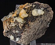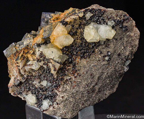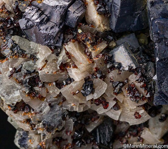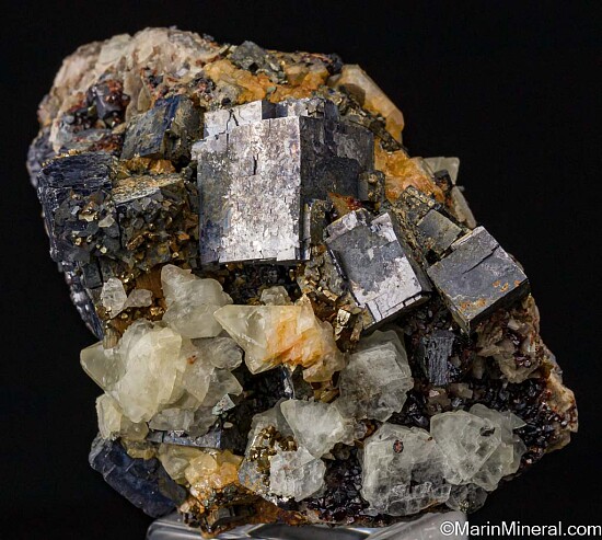 Bright metallic Galena cubes to 2.5cm on a silicified limestone matrix with red 'Ruby-Jack' Sphalerite crystals, Dolomite, and Calcite crystals from Treece, Kansas. The Galena are present on one side, but the specimen detached in the pocket and the Sphalerite and Calcite are present on all sides, making this a floater.