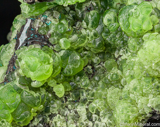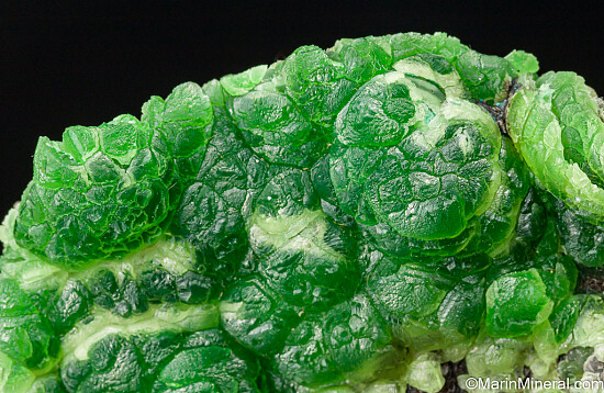 Intense, deep green Smithsonite from the 79 Mine. The Cuprian Smithsonite from the 79 Mine has some of the best green color from anywhere and this is a great wxample of that quality. Thick undamaged layers of satiny, translucent Smithsonite covering matrix. The color is a rich, deep green that grades to a more apple green on the far right side.