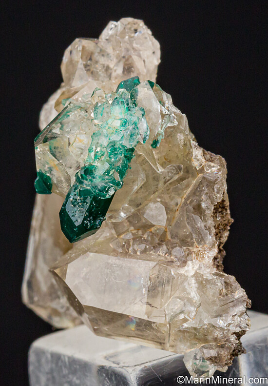 Cluster of clear Quartz crystals with Dioptase. The main Dioptase is 1.3cm long, double-terminated, with both ends extending out opposite sides of the Quartz cluster. Old, rare specimen. Dioptase, when included in Quartz crystals, make rare and valuable specimens.