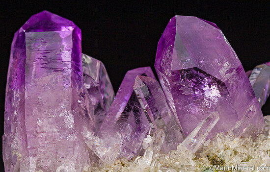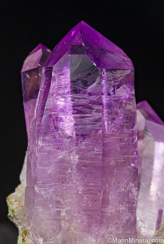Glassy, transparent Amethyst crystals to 3.3 cm on matrix. High quality undamaged specimen with both the good 'grape' coloration and the green Epidote rich matrix. .