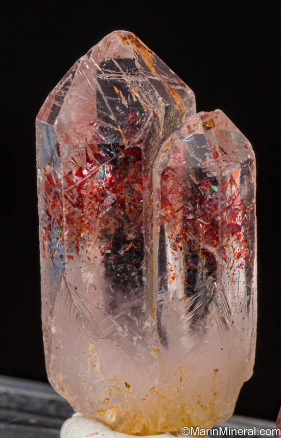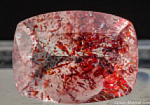 Bright red Hematite in undamaged, transparent Quartz crystals (2.2cm) with a faceted gemstone 1.2 x 0.8 x 0.5 cm in size and 2.8 carats in weight. These have great color and sparkle and are marketed as 'Disco Fire' Quartz. The Hematite forms a phantom zone in the Quartz, above which also has white hair-like inclusions of an unidentified mineral.