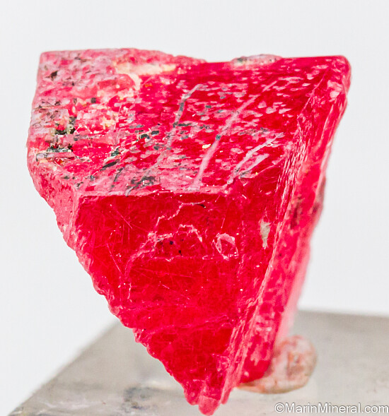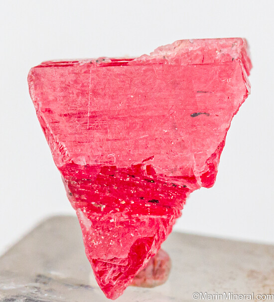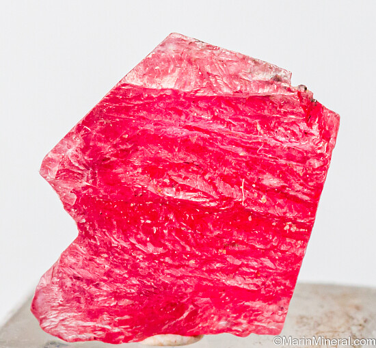 Gem quality bright red Rhodonite crystal from recent production in Brazil. The crystal has a mixture of crystal faces and some contact/breakage faces. Bright cherry red color and translucent to transparent. Weighs 9.3 carats.